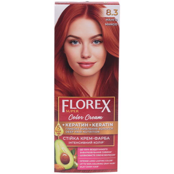 | | Крем-краска для волос Florex Super 8.3 Манго стойкая с маслом Оливы + кератинКрем-краска для волос Florex Super 8.3 Манго стойкая с маслом Оливы + кератин